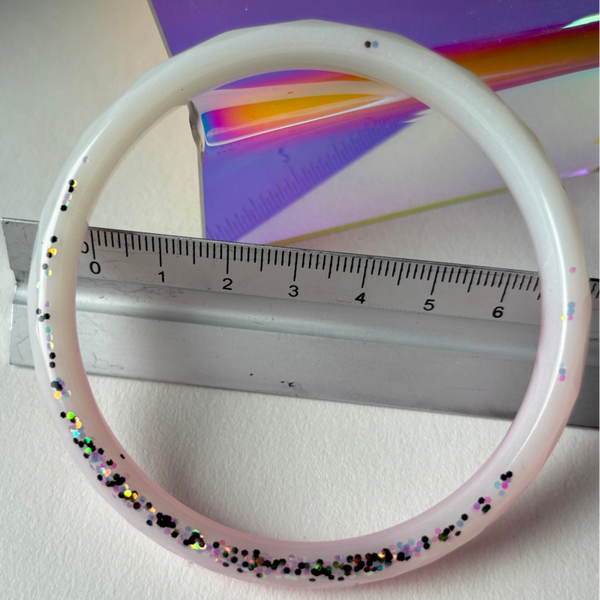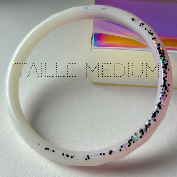 ✨ Jonc en résine facetté blanc avec un souçon de rose, paillettes irisées.