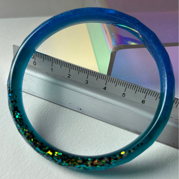 ✨ Jonc en résine facetté vert foncé et bleu nacré, paillettes irisées.