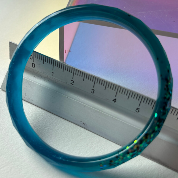 ✨ Jonc en résine facetté vert foncé et bleu nacré, paillettes irisées.