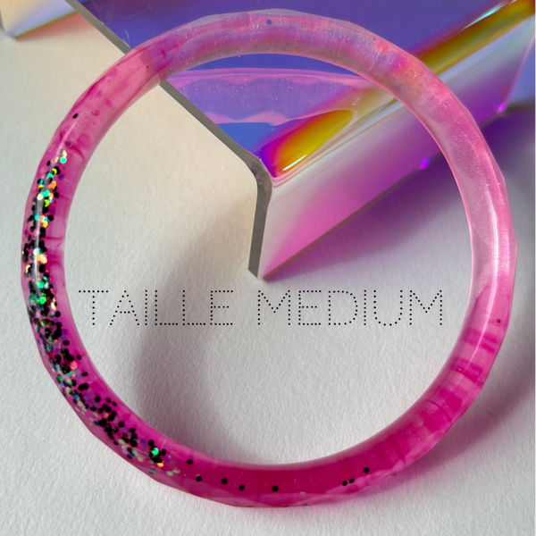 ✨ Jonc en résine facetté rose fushia et rose clair marbré, paillettes irisées.