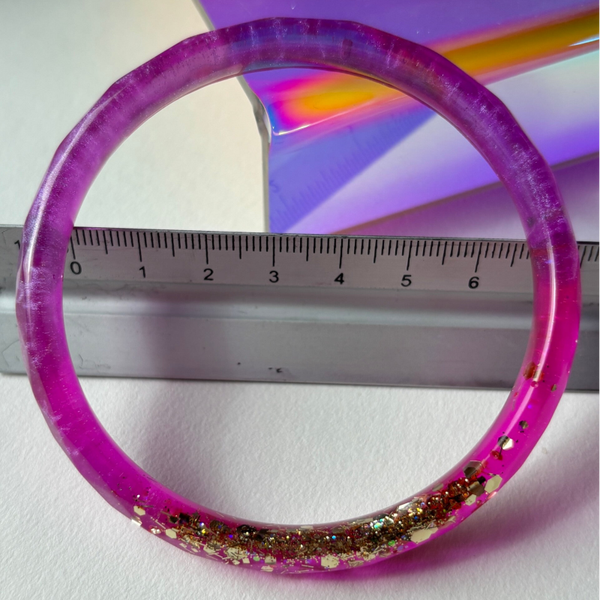 ✨ Jonc en résine facetté fushia et violet, paillettes dorées.