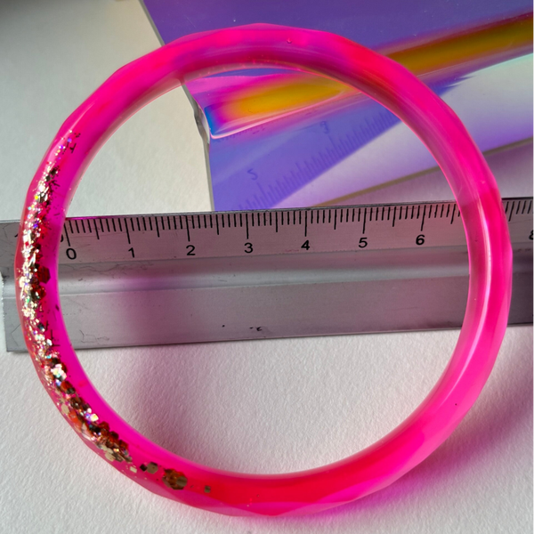 ✨ Jonc en résine facetté rose fluo, paillettes dorées.