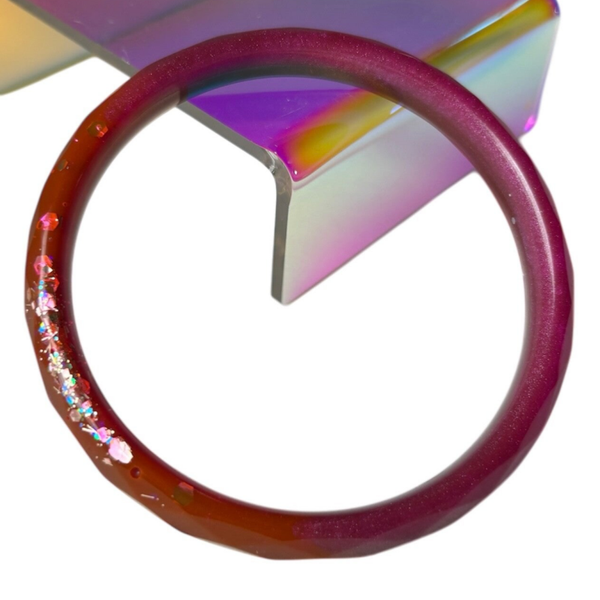 ✨ Jonc en résine facetté cassis aubergine, paillettes pêche dorée.
