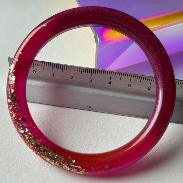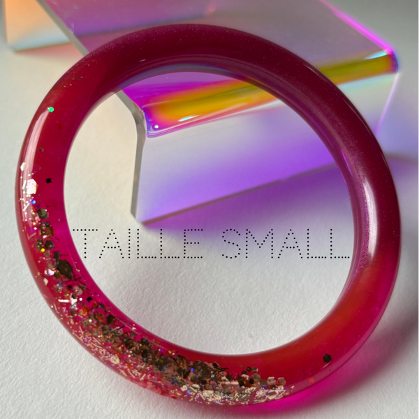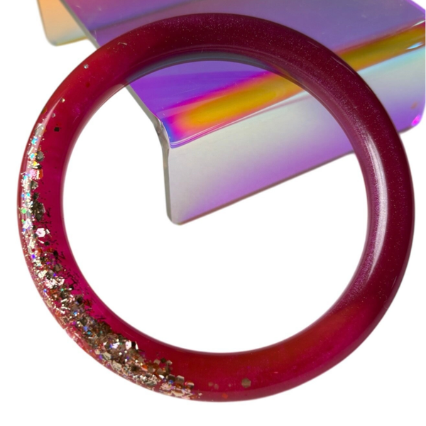 ✨ Jonc en résine rond aubergine grenadine, paillettes pêche dorée.