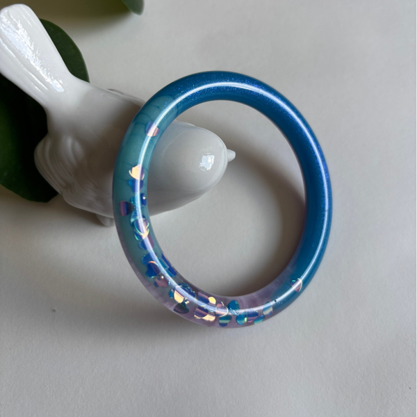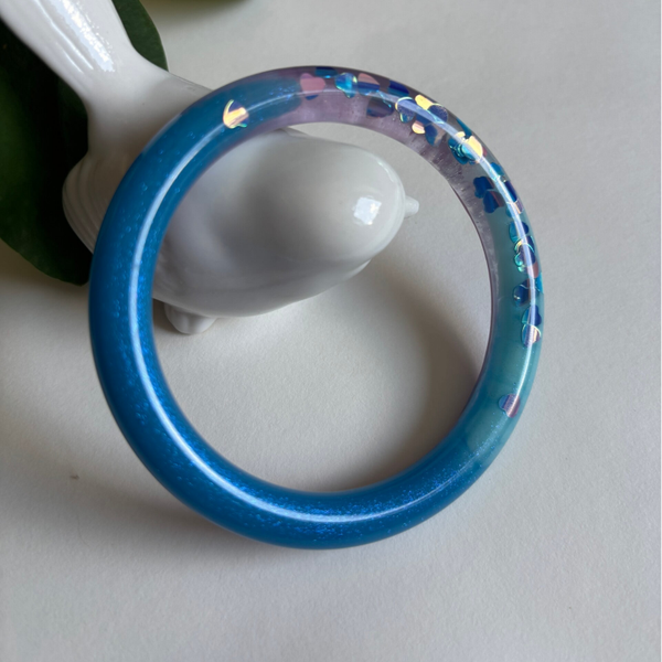 ✨ Jonc en résine facetté bleu mauve et transparent, paillettes cœurs irisés.
